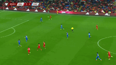 第9分钟,哈萨克斯坦后卫禁区被断球,詹姆斯抽射变线破门,威尔士1-0。